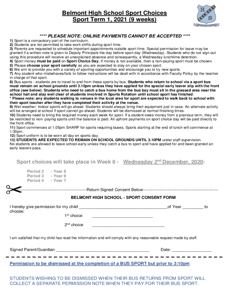 Belmont High School Sport Choices Sport Term 1, 2021 (9 weeks) **** PLEASE NOTE: ONLINE PAYMENTS CANNOT BE ACCEPTED **** 1) Sport is a compulsory part of the curriculum. 2) Students are not permitted