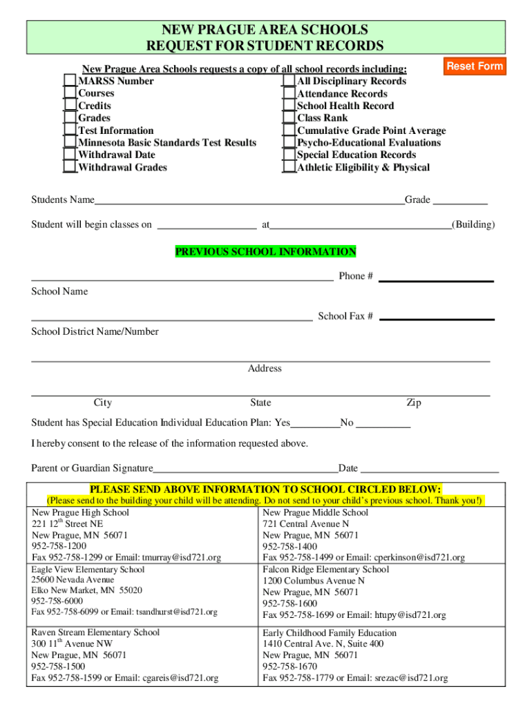 NEW PRAGUE AREA SCHOOLS REQUEST FOR STUDENT RECORDS Reset Form New Prague Area Schools requests a copy of all school records including: All Disciplinary Records MASS Number Courses Attendance Records