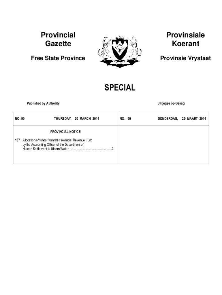 Provincial GazetteProvinsiale KoerantFree State ProvinceProvinsie VrystaatSPECIAL Published by Authority NO. 99THURSDAY, 20 MARCH 2014 PROVINCIAL NOTICE157 Allocation of funds from the Provincial