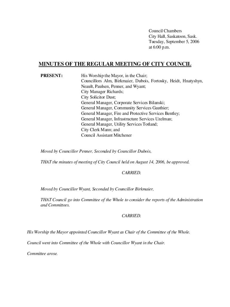Council Chambers City Hall, Saskatoon, Sask. Tuesday, September 5, 2006, at 6:00 p.m.MINUTES OF THE REGULAR MEETING OF CITY COUNCIL PRESENT:His Worship the Mayor, in the Chair; Councillors ALM, Bookmaker,
