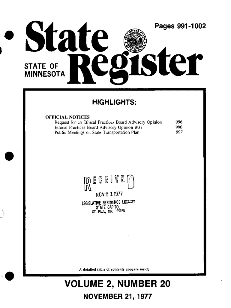 Stoppages 9911002RegisterwwSTATE OF MINNESOTAHIGHLIGHTS: OFFICIAL NOTICES Request for an Ethical Practices Board Advisory Opinion996 996 Ethical Practices Board Advisory Opinion #37Plan 997Public