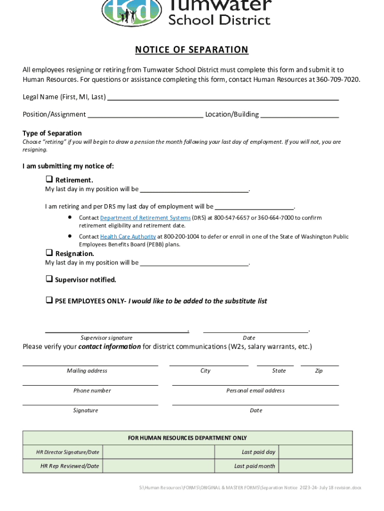 NOTICE OF SEPARATION All employees resigning or retiring from Tum water School District must complete this form and submit it to Human Resources. For questions or assistance completing this form,