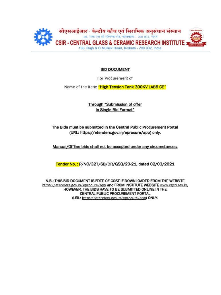 BID DOCUMENT For Procurement of Name of the Item: High Tension Tank 300KV LAB6 Through Submission of offer in Singled Formative Bids must be submitted in the Central Public Procurement Portal (URL:
