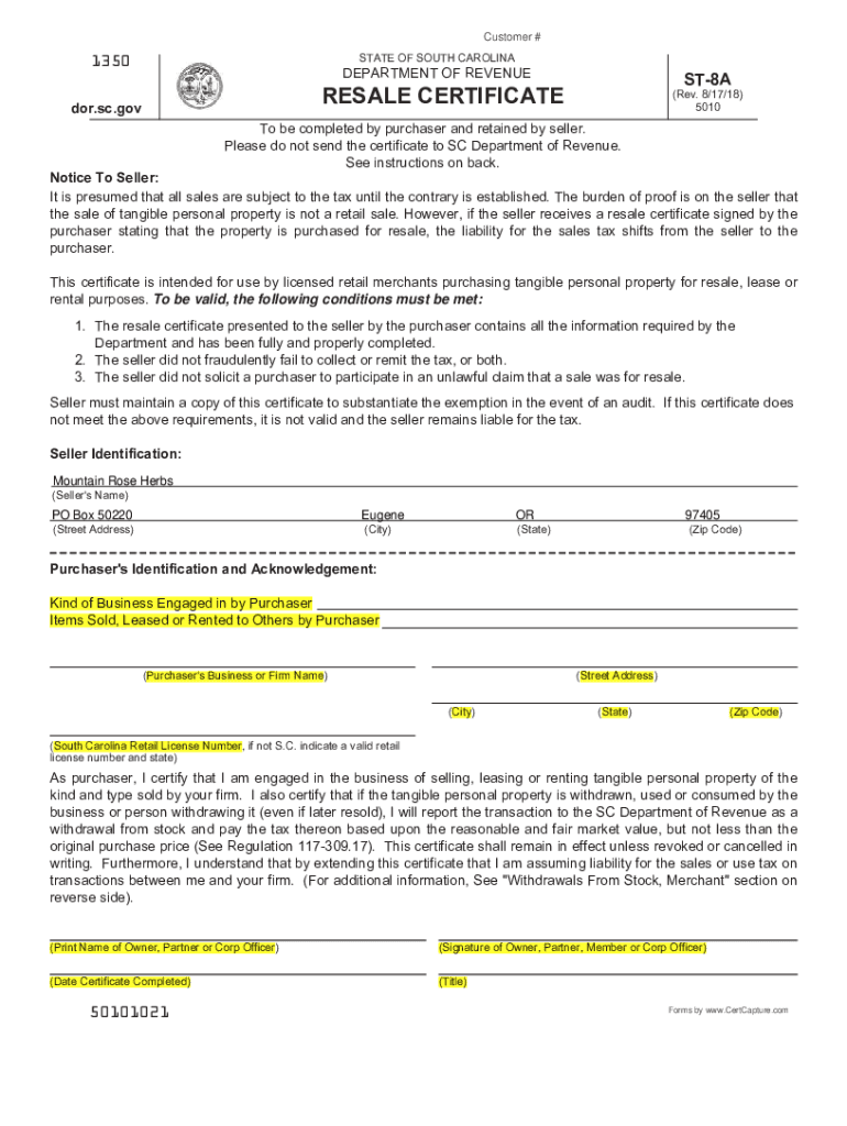 Customer # STATE OF SOUTH CAROLINA1350DEPARTMENT OF REVENUEST8ARESALE Certificated or.SC.gov(Rev. 8/17/18) 5010To be completed by purchaser and retained by seller. Please do not send the certificate