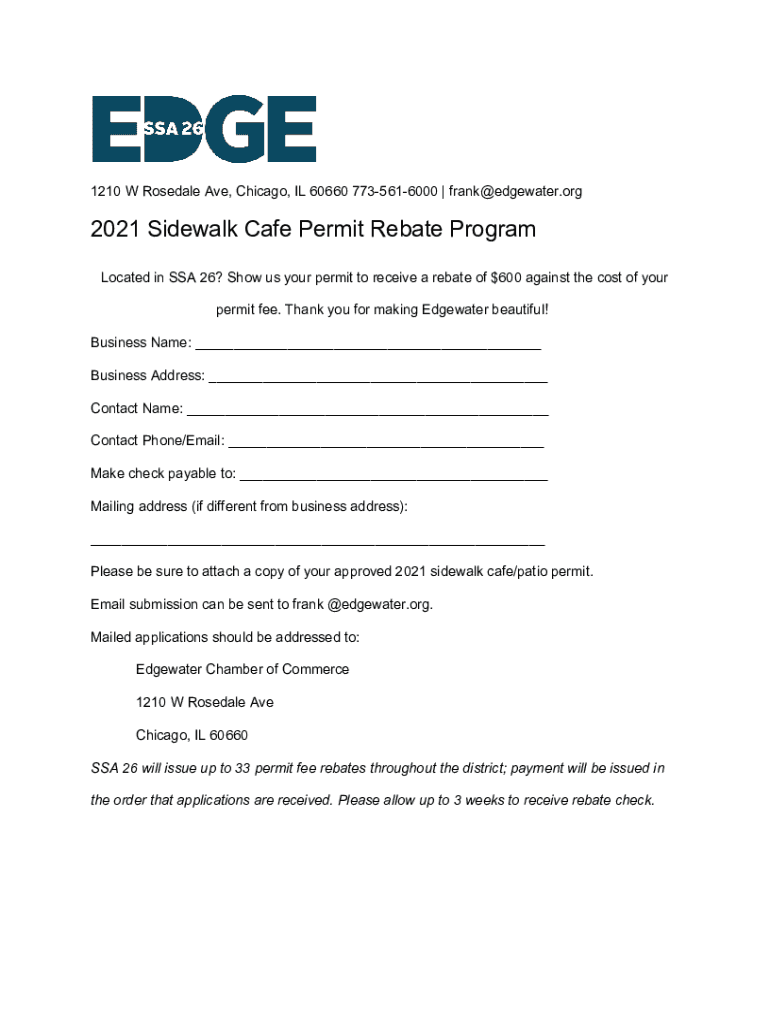 1210 W Rose dale Ave, Chicago, IL 60660 7735616000 | frank@edgewater.org2021 Sidewalk Café Permit Rebate Program Located in SSA 26? Show us your permit to receive a rebate of $600 against the cost