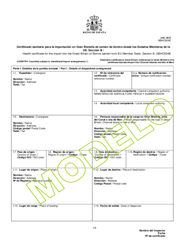 REIN ODE ESAA ASE2853 GBHC004ECertificado sanitation para la importation en Gran Break DE semen DE bovine DESE Los Estates Members de la UE. Section B / Health certificate for the import into the