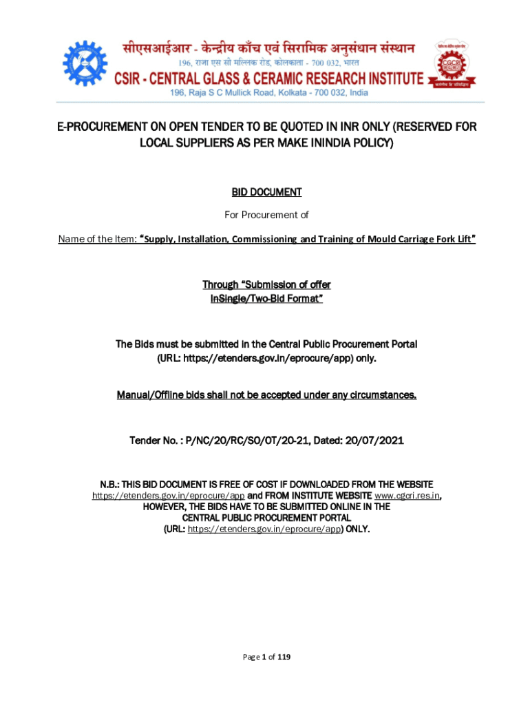 PROCUREMENT ON OPEN TENDER TO BE QUOTED IN INR ONLY (RESERVED FOR LOCAL SUPPLIERS AS PER MAKE IN INDIA POLICY)BID DOCUMENT For Procurement of Name of the Item: Supply, Installation, Commissioning