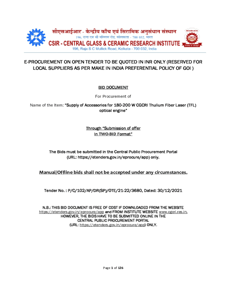 PROCUREMENT ON OPEN TENDER TO BE QUOTED IN INR ONLY (RESERVED FOR LOCAL SUPPLIERS AS PER MAKE IN INDIA PREFERENTIAL POLICY OF GOI)BID DOCUMENT For Procurement of Name of the Item: Supply of Accessories