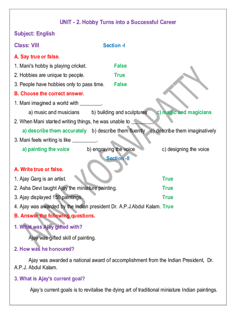 UNIT 2. Hobby Turns into a Successful Career Subject: English Class: Vivisection IA. Say true or false. 1. Mani\'s hobby is playing cricket. False2. Hobbies are unique to people. True3. People have