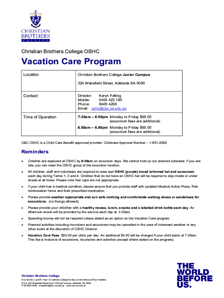 Christian Brothers College OSHCVacation Care Program Location Christian Brothers College Junior Campus 324 Wakefield Street, Adelaide SA 5000ContactDirector: Karyn Falling Mobile: 0404 423 190 Phone: