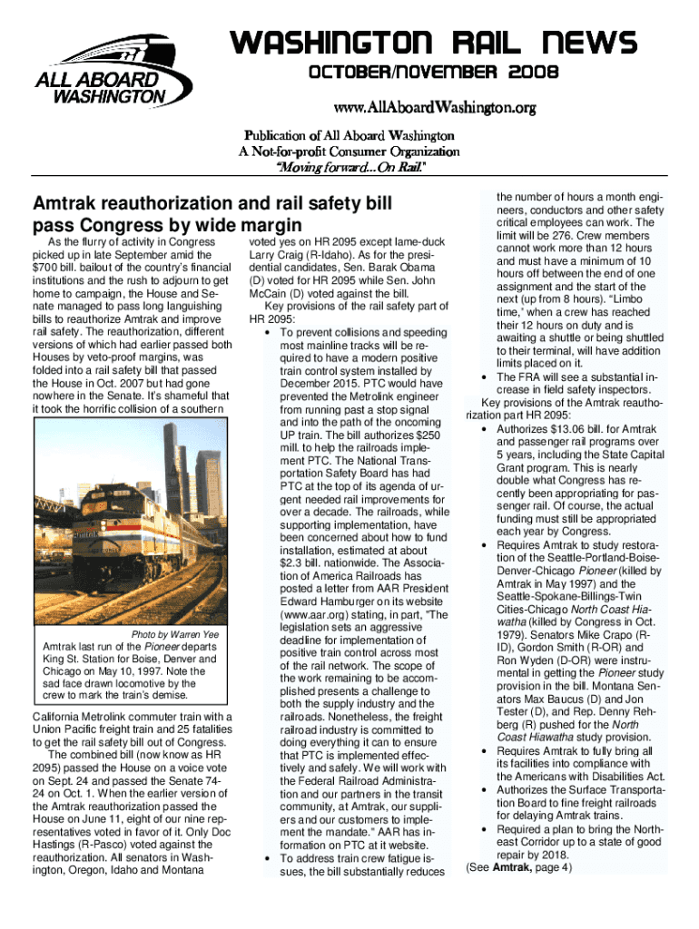 Washington Rail News October/November October November 2008 2008 www.AllAboardWashington.org Publication of All Aboard Washington A Not Notforforprofit Consumer Organization Moving forward... On Rail.\”