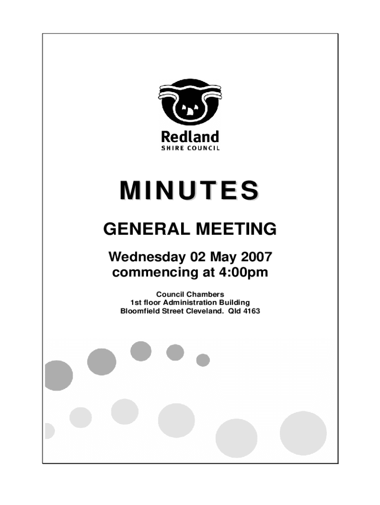 MINUTES GENERAL MEETING Wednesday 02 May 2007 commencing at 4:00pm Council Chambers 1st floor Administration Building Bloomfield Street Cleveland. QLD 4163GENERAL MEETING MINUTES02 MAY 2007TABLE OF
