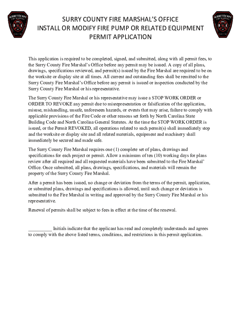 SORRY COUNTY FIRE MARSHALS OFFICE INSTALL OR MODIFY FIRE PUMP OR RELATED EQUIPMENT PERMIT APPLICATION This application is required to be completed, signed, and submitted, along with all permit fees,