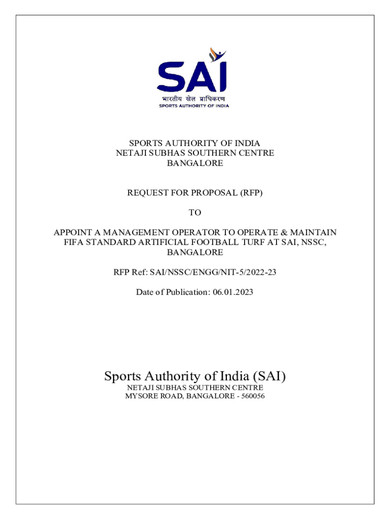 SPORTS AUTHORITY OF INDIA NET AJI SUBHASH SOUTHERN Center BANGALORE REQUEST FOR PROPOSAL (RFP) TO APPOINT A MANAGEMENT OPERATOR TO OPERATE & MAINTAIN FIFA STANDARD ARTIFICIAL FOOTBALL TURF AT SAI,