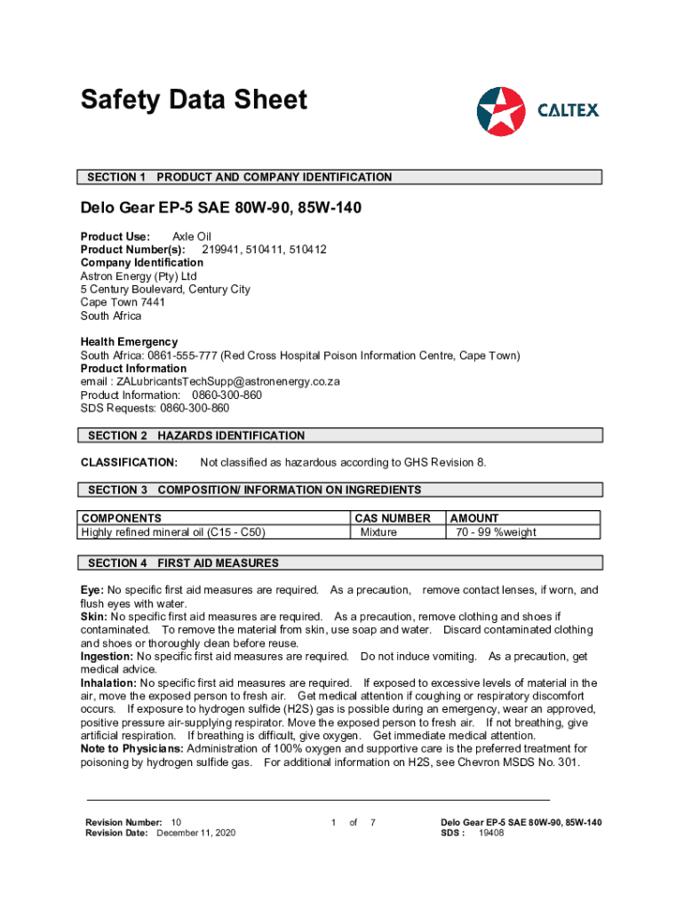 Safety Data Sheet SECTION 1PRODUCT AND COMPANY IDENTIFICATIONDelo Gear EP5 SAE 80W90, 85W140 Product Use: Axle Oil Product Number(s): 219941, 510411, 510412 Company Identification Aston Energy (Pty)