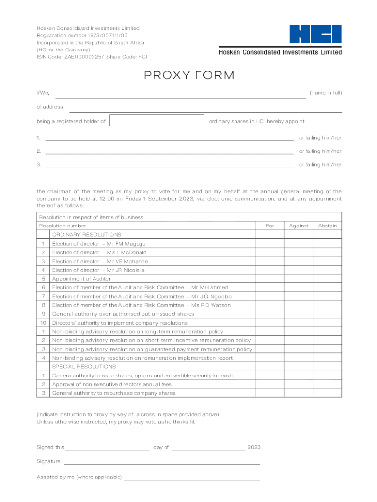 Hos ken Consolidated Investments Limited Registration number 1973/007111/06 Incorporated in the Republic of South Africa (HCI or the Company) ISIN Code: ZAE000003257 Share Code: HAProxy FORM I/We,
