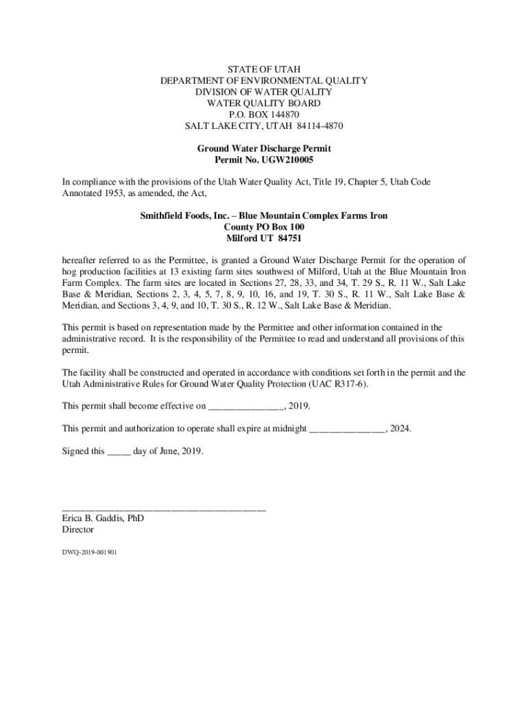 STATE OF UTAH DEPARTMENT OF ENVIRONMENTAL QUALITY DIVISION OF WATER QUALITY BOARD P.O. BOX 144870 SALT LAKE CITY, UTAH 841144870 Ground Water Discharge Permit No. UGW210005 In compliance with the