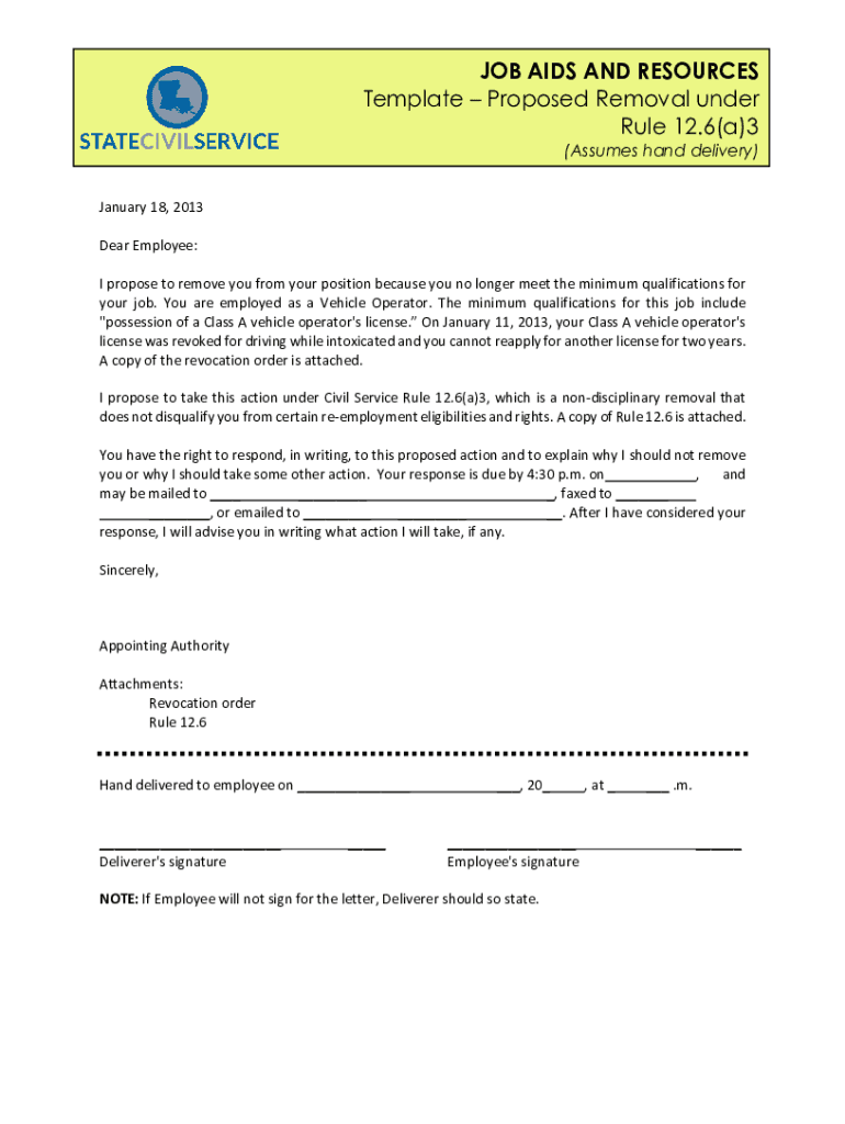 JOB AIDS AND RESOURCES Template Proposed Removal under Rule 12.6(a)3 (Assumes hand delivery) January 18, 2013, Dear Employee: I propose to remove you from your position because you no longer meet