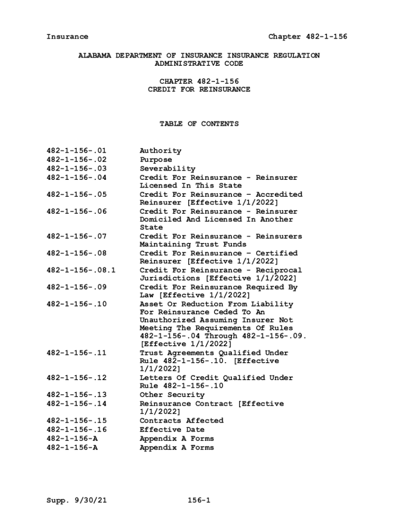 InsuranceChapter 4821156ALABAMA DEPARTMENT OF INSURANCE REGULATION ADMINISTRATIVE CODE CHAPTER 4821156 CREDIT FOR REINSURANCETABLE OF CONTENTS 4821156.01 4821156.02 4821156.03 4821156.04 4821156.05