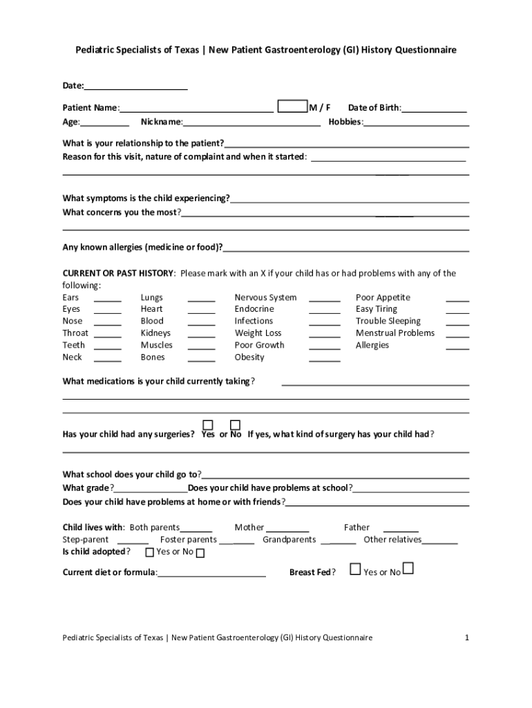 Pediatric Specialists of Texas | New Patient Gastroenterology (GI) History Questionnaire Date: Patient Name: Age’M/F Date of Birth: Hobbies:Nickname:What is your relationship to the patient? Reason