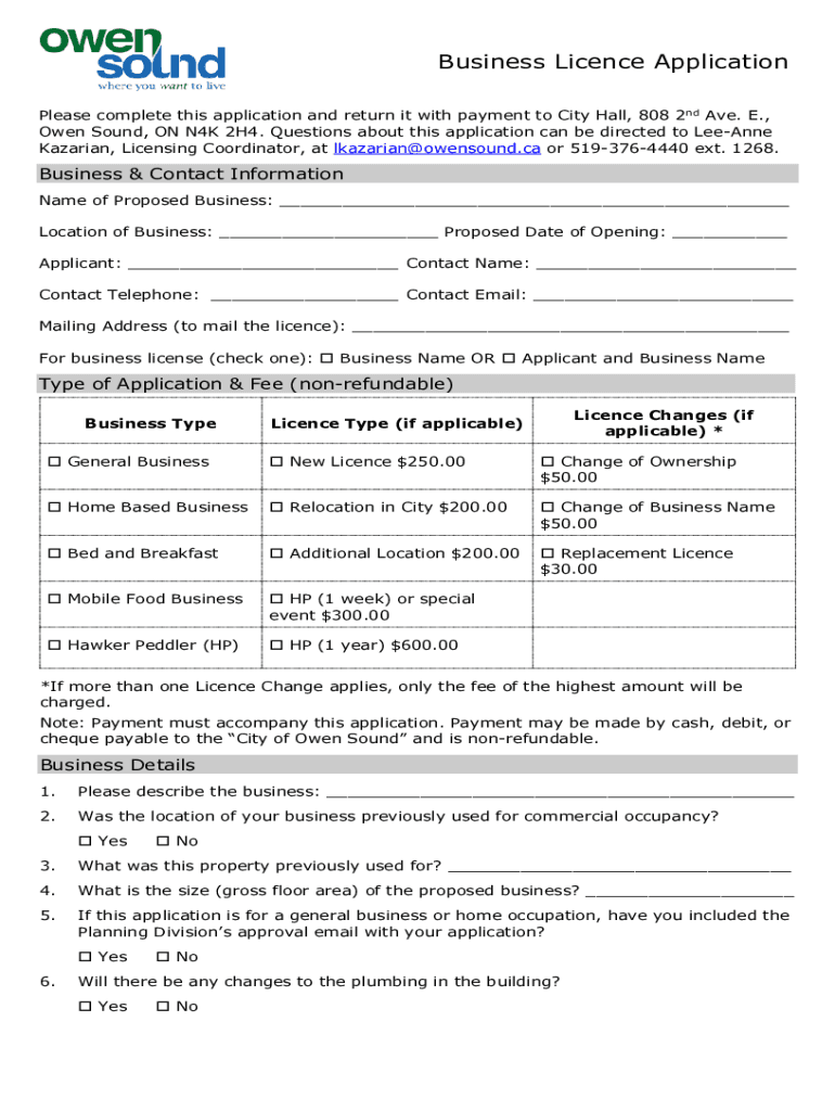 Business License Application Please complete this application and return it with payment to City Hall, 808 2nd Ave. E., Owen Sound, ON N4K 2H4. Questions about this application can be directed to