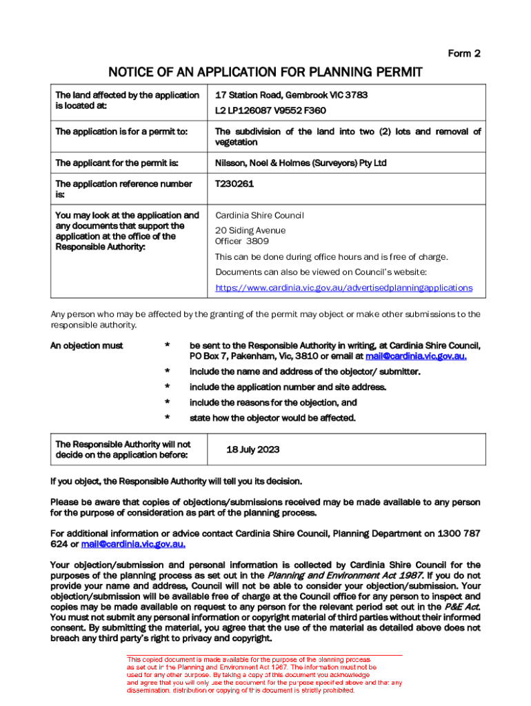 Form 2NOTICE OF AN APPLICATION FOR PLANNING PERMIT The land affected by the application is located at:17 Station Road, Gem brook VIC 3783The application is for a permit to:The subdivision of the land