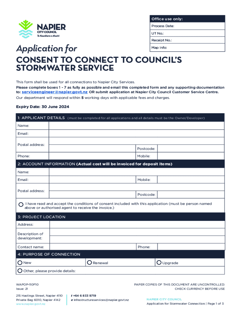 Office use only: Process Date: UT No.: Receipt No.:Application format Info:CONSENT TO CONNECT TO COUNCILS STORMWATER SERVICE This form shall be used for all connections to Napier City Services. Please