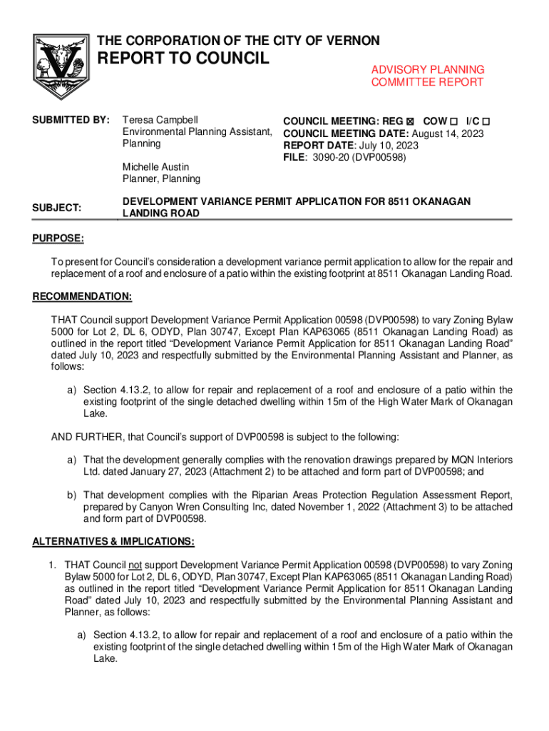 THE CORPORATION OF THE CITY OF VERNONREPORT TO COUNCILSUBMITTED BY:Teresa Campbell Environmental Planning Assistant, PlanningADVISORY PLANNING COMMITTEE REPORT COUNCIL MEETING: REG COW I/C COUNCIL