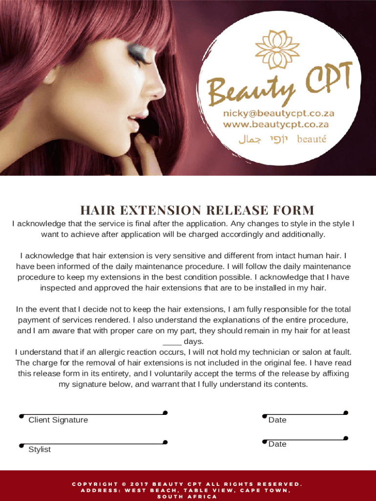 HAIR EXTENSION RELEASE FORM I acknowledge that the service is final after the application. Any changes to style in the style I want to achieve after application will be charged accordingly and additionally.