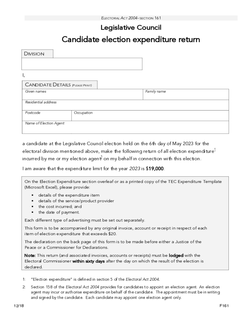 ELECTORAL ACT 2004 SECTION 161Legislative CouncilCandidate election expenditure return