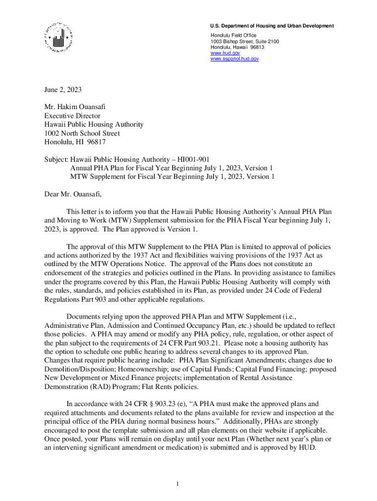 U.S. Department of Housing and Urban Development Honolulu Field Office 1003 Bishop Street, Suite 2100 Honolulu, Hawaii 96813 www.hud.gov www.espanol.hud.govJune 2, 2023 Mr. Hakim Unsafe Executive