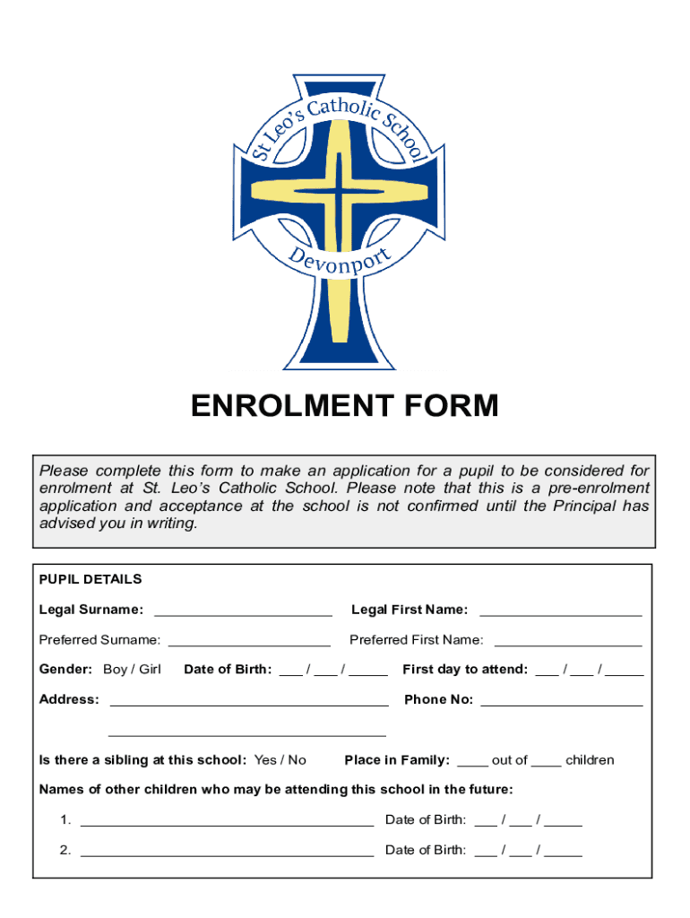 Enrollment FORM Please complete this form to make an application for a pupil to be considered for enrollment at St. Leos Catholic School. Please note that this is a preenrolment application and acceptance