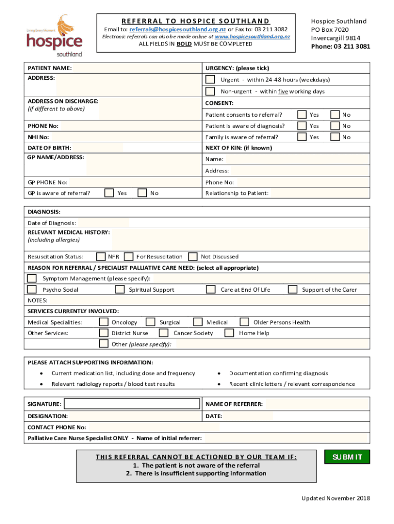 REFERRAL TO HOSPICE SOUTHLANDHospice Southland PO Box 7020 Invercargill 9814 Phone: 03 211 3081Email to: referrals@hospicesouthland.org.nz or Fax to: 03 211 3082 Electronic referrals can also be made