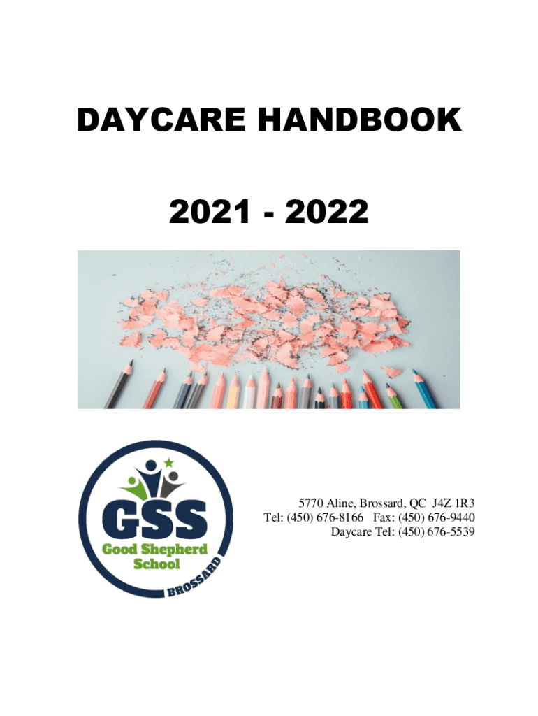 DAYCARE HANDBOOK 2021 20225770 Aline, Brossard, QC J4Z 1R3 Tel: (450) 6768166 Fax: (450) 6769440 Daycare Tel: (450) 6765539Table of Contents Introduction Page 3 1. Registration and Attendance Page