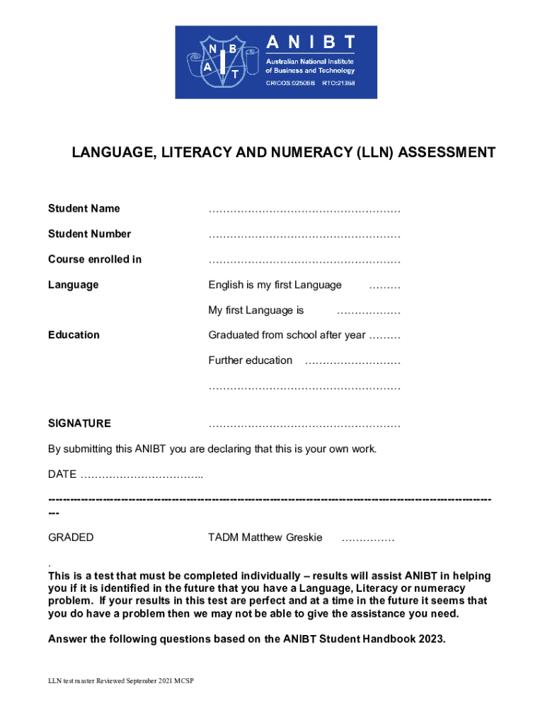 LANGUAGE, LITERACY AND NUMERACY (LLN) ASSESSMENTStudent NameStudent Outercourse enrolled inLanguageEnglish is my first Language