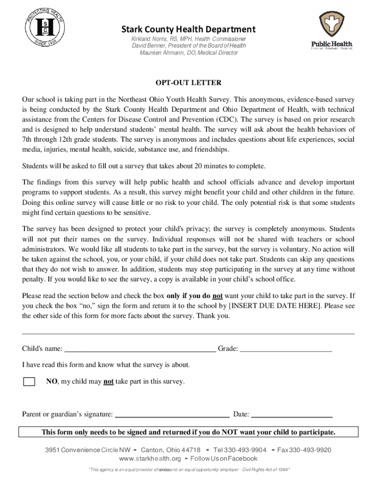 Stark County Health Department Kirkland Norris, RS, MPH, Health Commissioner David Banner, President of the Board of Health Maureen Ahmad, DO, Medical DirectorOPTOUT LETTER Our school is taking part