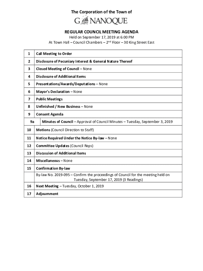 The Corporation of the Town regular COUNCIL MEETING AGENDA Held on September 17, 2019, at 6:00 PM At Town Hall Council Chambers 2nd Floor 30 King Street East 1Call Meeting to Order2Disclosure of Pecuniary