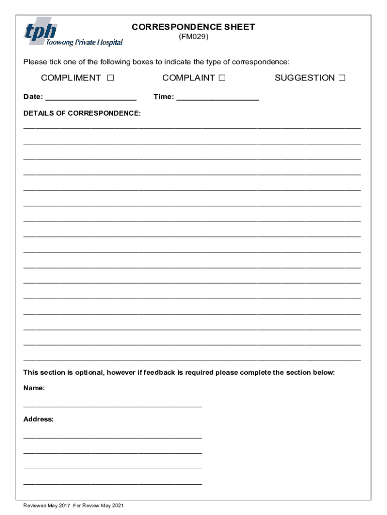 CORRESPONDENCE SHEET (FM029) Please tick one of the following boxes to indicate the type of correspondence:COMPLIMENT Date: ___COMPLAINTSUGGESTIONTime: ___DETAILS OF CORRESPONDENCE: ___ ___ ___ ___