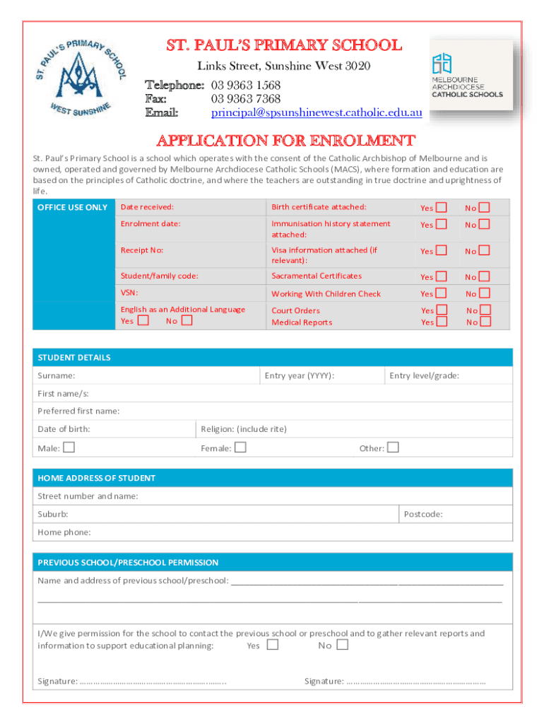ST. PAUL PRIMARY SCHOOL Links Street, Sunshine West 3020 Telephone: 03 9363 1568 Fax: 03 9363 7368 Email: principal@spsunshinewest.catholic.edu.auAPPLICATION FOR Enrollment St. Paul's Primary School