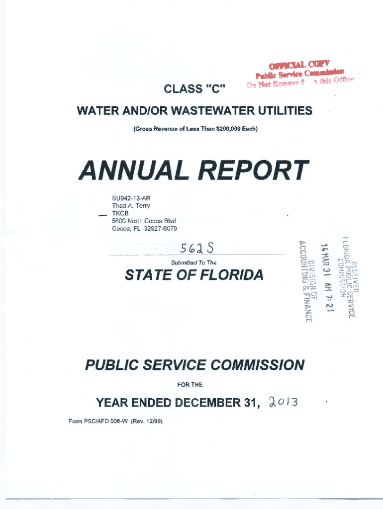 CLASS \” C\” WATER AND/OR WASTEWATER UTILITIES (Gross Revenue of Less Than $200,000 Each)ANNUAL REPORT _SU94213AR Thad A Terry KCB 5600 North Cocoa Blvd. Cocoa, FL 329276079__. J: (\”\”) ()Submitted