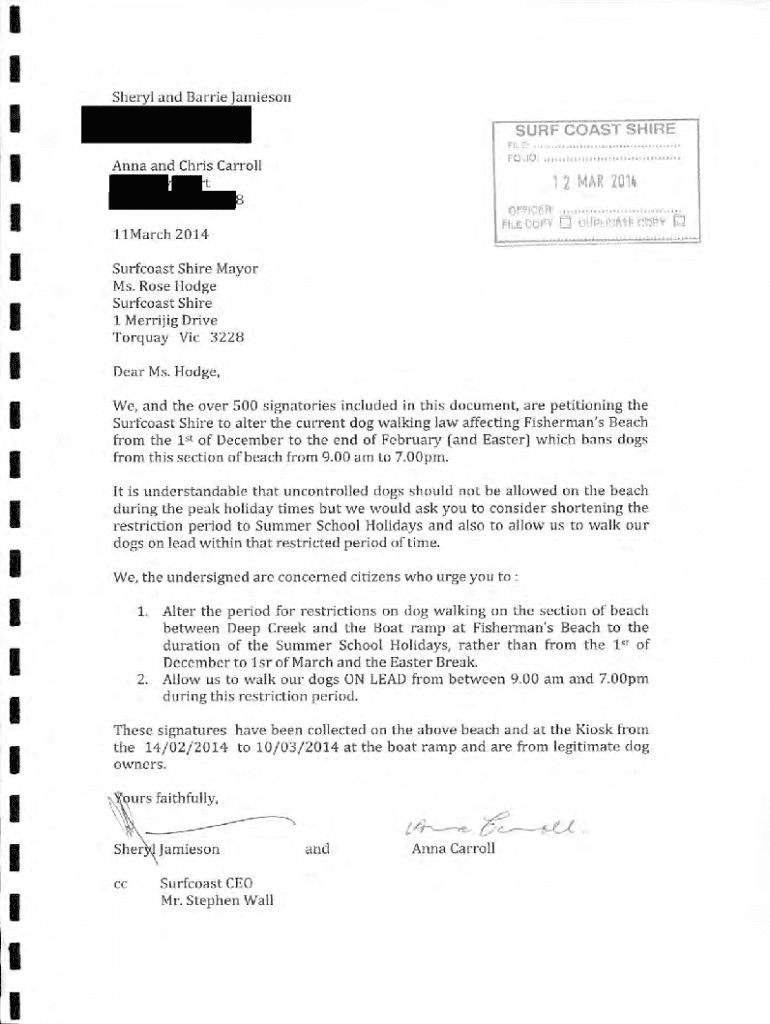 Sheryl an n d Barrie JamiesonSURF COAST SHIRE FILL\'Anna an n d Chris Carroll7 MAR Z014 1 File CBN\' Li11March 20141LItdtj\'Y\'\'Surf coast Shire Mayor Ms. Rose Hodge Surf coast Shire 1 Merging Drive
