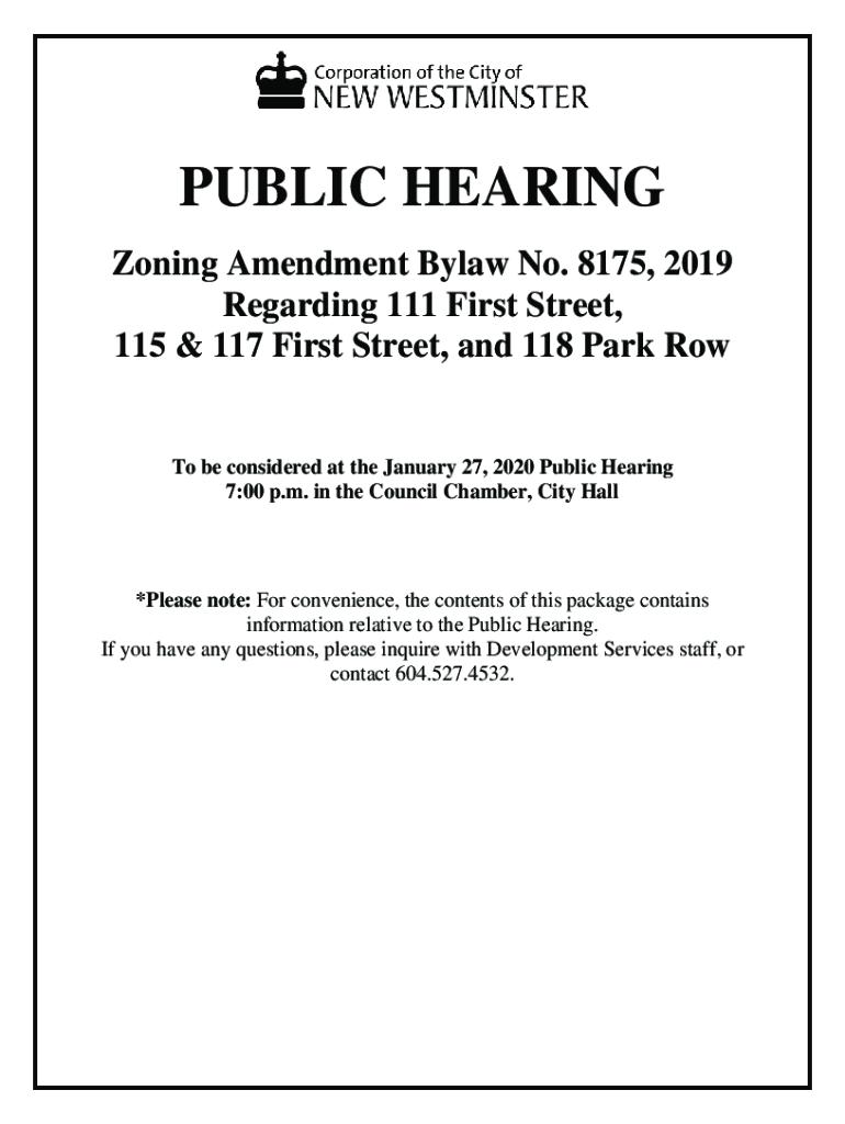 PUBLIC HEARING Zoning Amendment Bylaw No. 8175, 2019 Regarding 111 First Street, 115 & 117 First Street, and 118 Park Growth be considered at the January 27, 2020, Public Hearing 7:00 p.m. in the