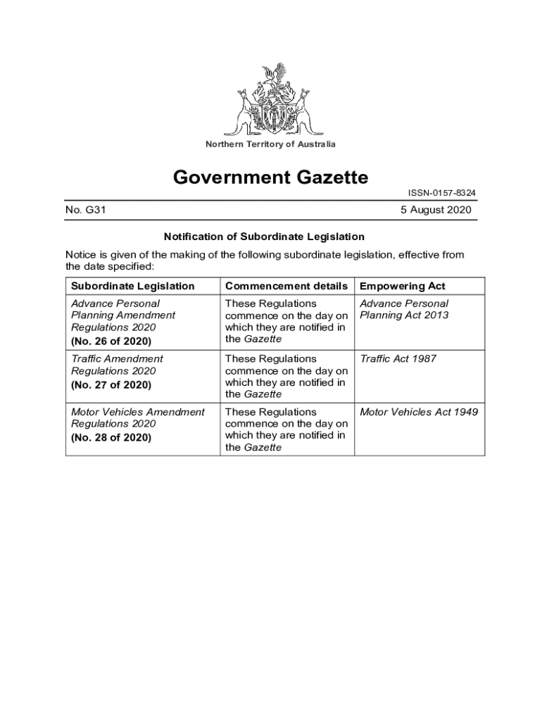 Northern Territory of AustraliaGovernment Gazette No. G31ISSN015783245 August 2020 Notification of Subordinate LegislationNotice is given of the making of the following subordinate legislation, effective