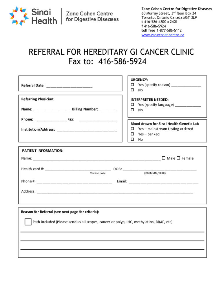 Zane Cohen Center for Digestive Diseases 60 Murray Street, 3rd floor Box 24 Toronto, Ontario Canada M5T 3L9 t 4165864800 × 2401 f 4165865924 toll-free 18775865112 www.zanecohencentre.caREFERRAL FOR