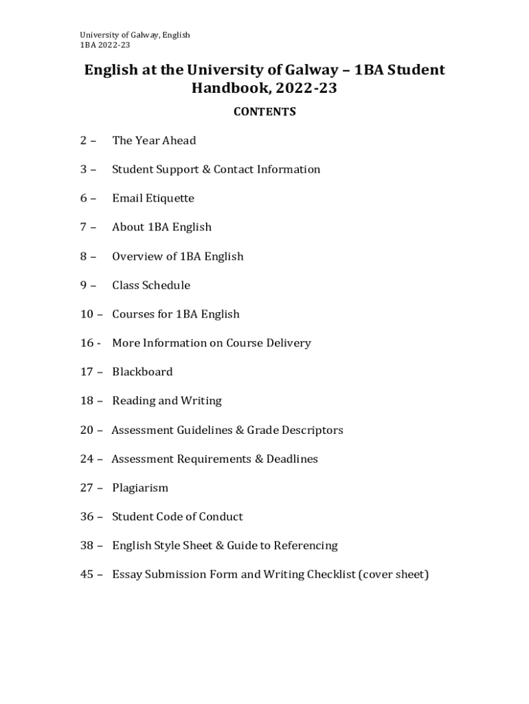 University of Galway, English 1BA 202223English at the University of Galway 1BA Student Handbook, 202223 CONTENTS 2The Year Ahead3Student Support & Contact Information6Email Etiquette7About 1BA English8Overview