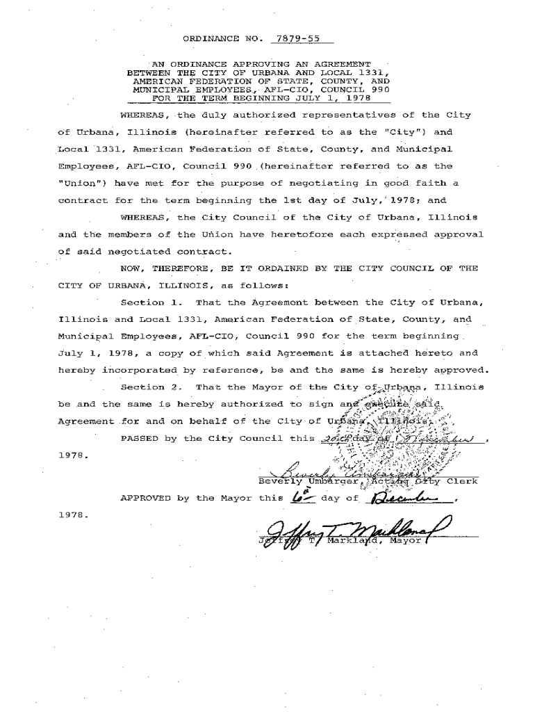 ORDINANCE NO.787955AN ORDINANCE APPROVING AN AGREEMENT BETWEEN THE CITY OF URBANA AND LOCAL 1331, AMERICAN FEDERATION OF STATE, COUNTY, AND MUNICIPAL EMPLOYEES, AFL CIO, Council 990 FOR THE TERM BEGINNING