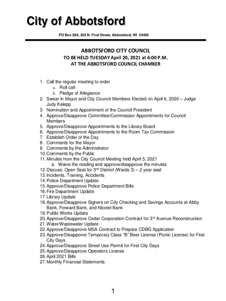 City of Abbotsford PO Box 589, 203 N. First Street, Abbotsford, WI 54405ABBOTSFORD CITY COUNCIL TO BE HELD TUESDAY, April 20, 2021, at 6:00 P.M. AT THE ABBOTSFORD COUNCIL CHAMBER 1. Call the regular