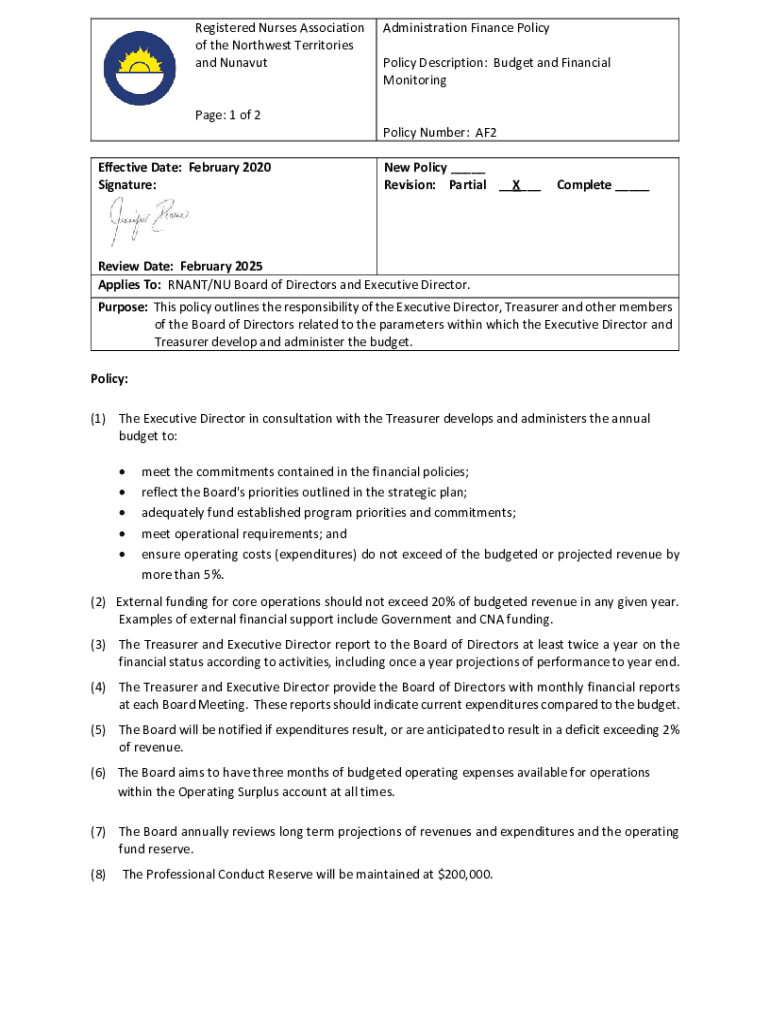 Registered Nurses Association of the Northwest Territories and Nunavut Page: 1 of 2 Effective Date: February 2020 Signature:Administration Finance Policy Description: Budget and Financial Monitoring