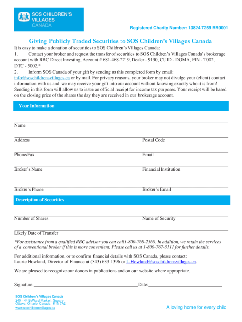 Registered Charity Number: 13824 7259 RR0001Giving Publicly Traded Securities to SOS Children's Villages Canada It is easy to make a donation of securities to SOS Children's Villages Canada: 1. Contact