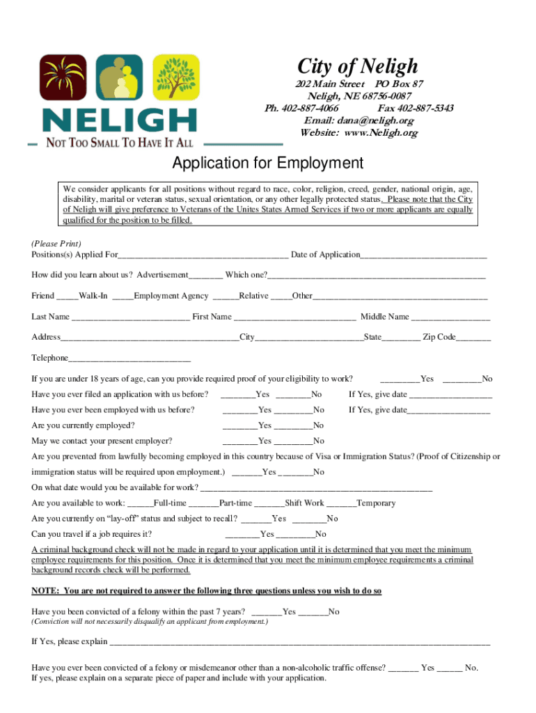 City of Neligh202 Main Street PO Box 87 Neigh, NE 687560087 pH. 4028874066 Fax 4028875343 Email: dana@neligh.org Website: www.Neligh.orgApplication for Employment We consider applicants for all positions